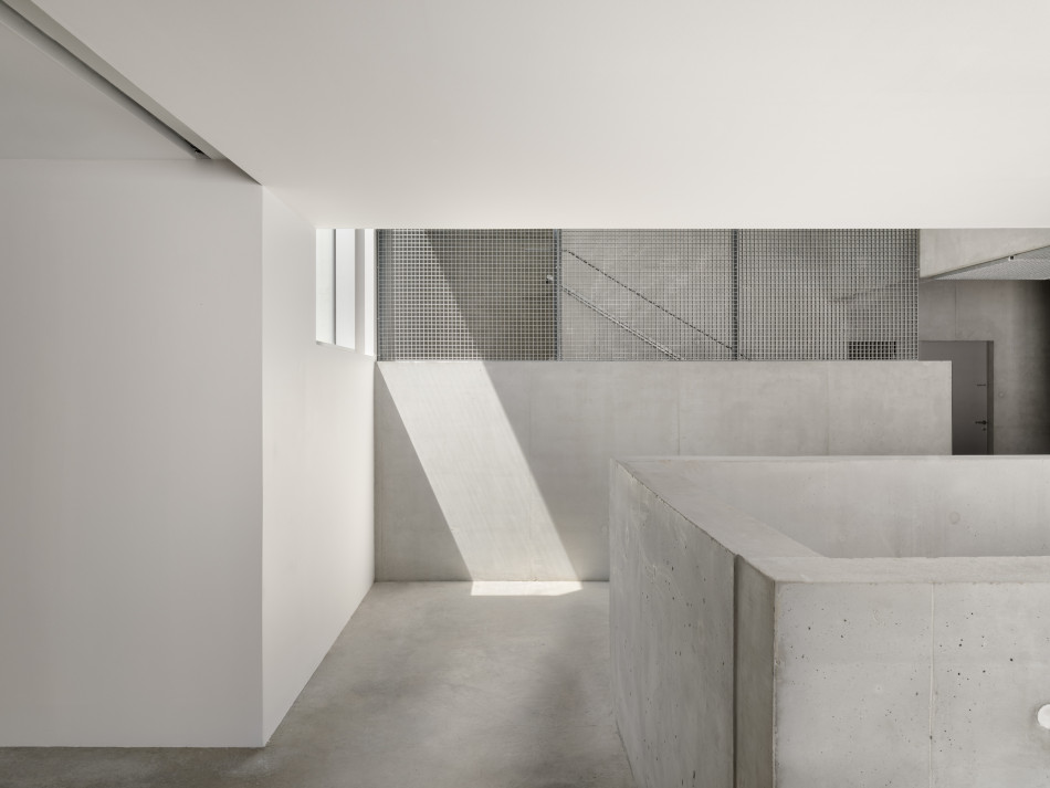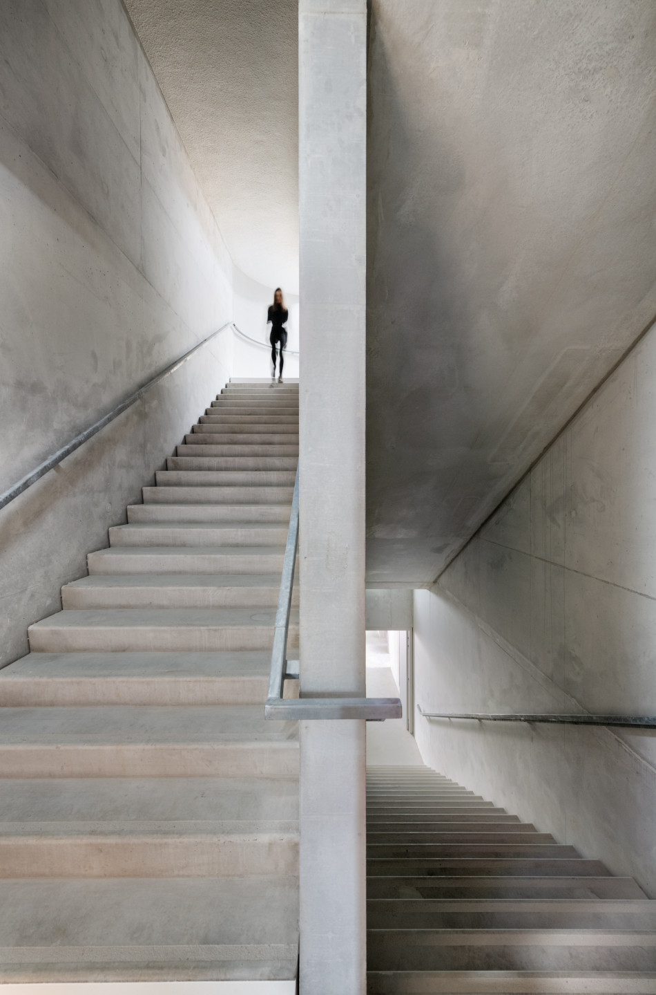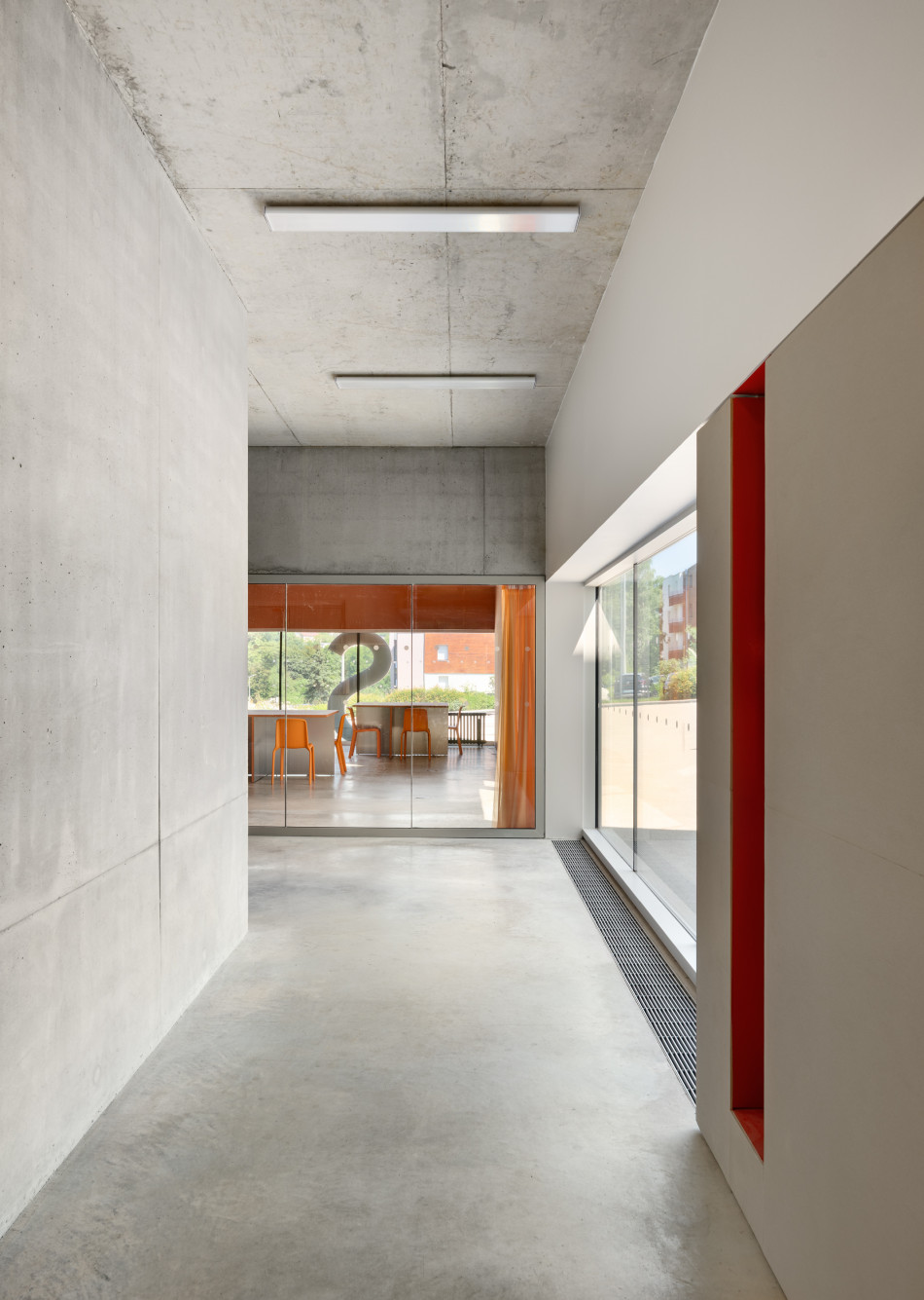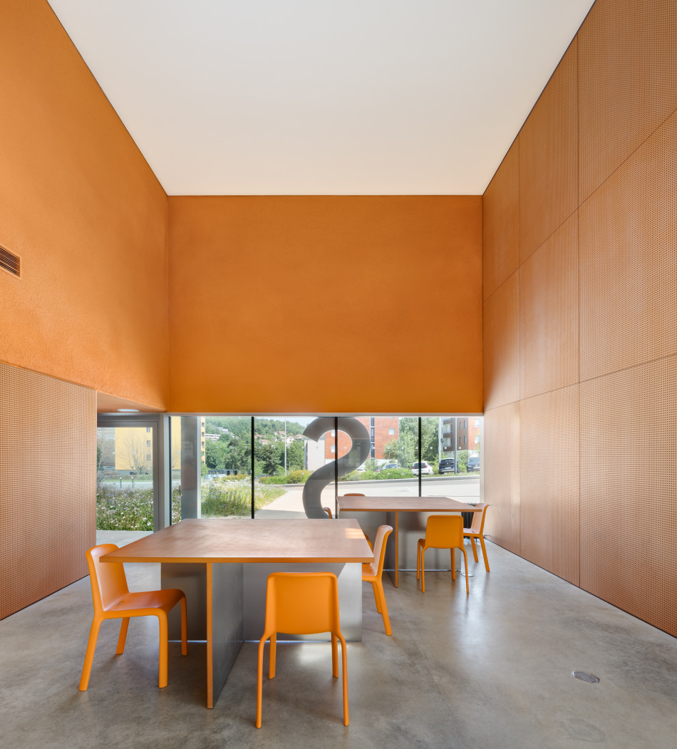 The spaces are cavernous and bathed in an abundance of natural light. A raw, rustic atmosphere emerges in them. The student common room with its double height in a vivid orange tone adds a contrast that showcases both the soft plainness of the concrete and the sense of surprise of this colourful burst.