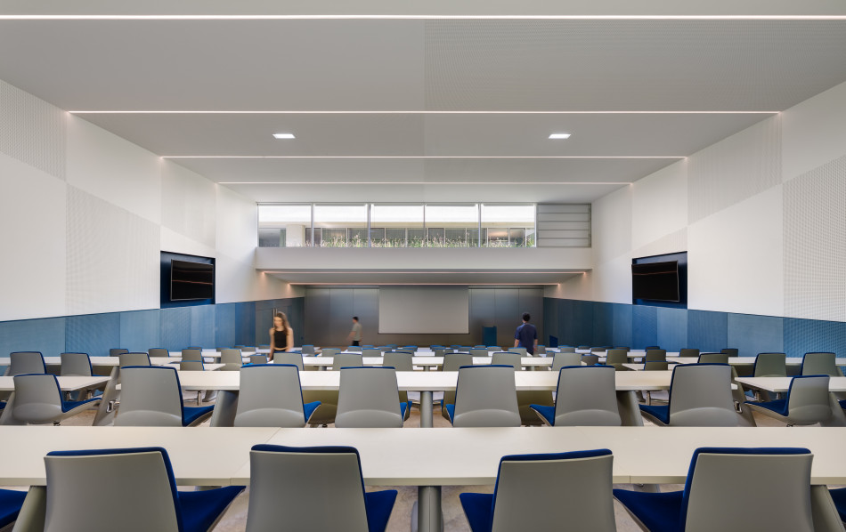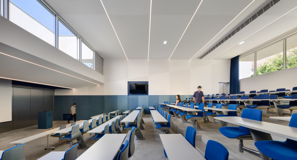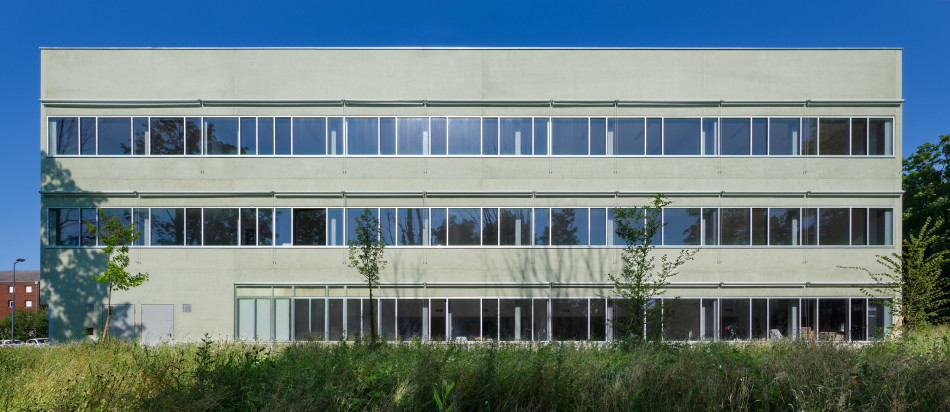 So, in a way, the building only has one face – that which looks out at the street, which is the main road running through the campus. The construction was divided into two parts to leave the possibility of a future extension being built. There is one section that contains the specific-purpose parts like the large lecture and conference hall with a big classroom and the administrative hub. And there is a second section that houses the ordinary classrooms.