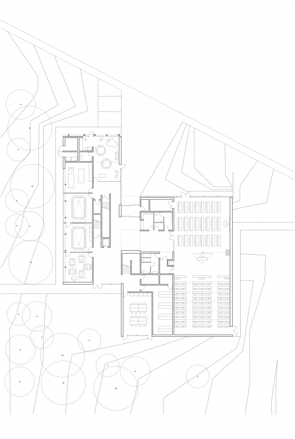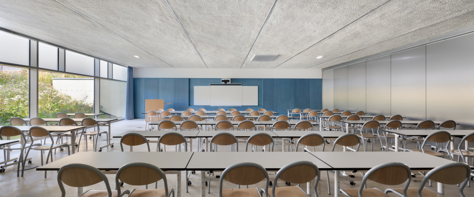 The large lecture and conference hall connects to an examinations room via a sliding partition. This sliding partition was not requested in the programme, but it makes it possible to create a vast space that is ideally suited to the international congresses that take place here. Natural light fills the space and the cross-section shows the advantage of bringing these two spaces together. So we have here a small building that is, in fact, very big. It offers space that can expand in accordance with uses.