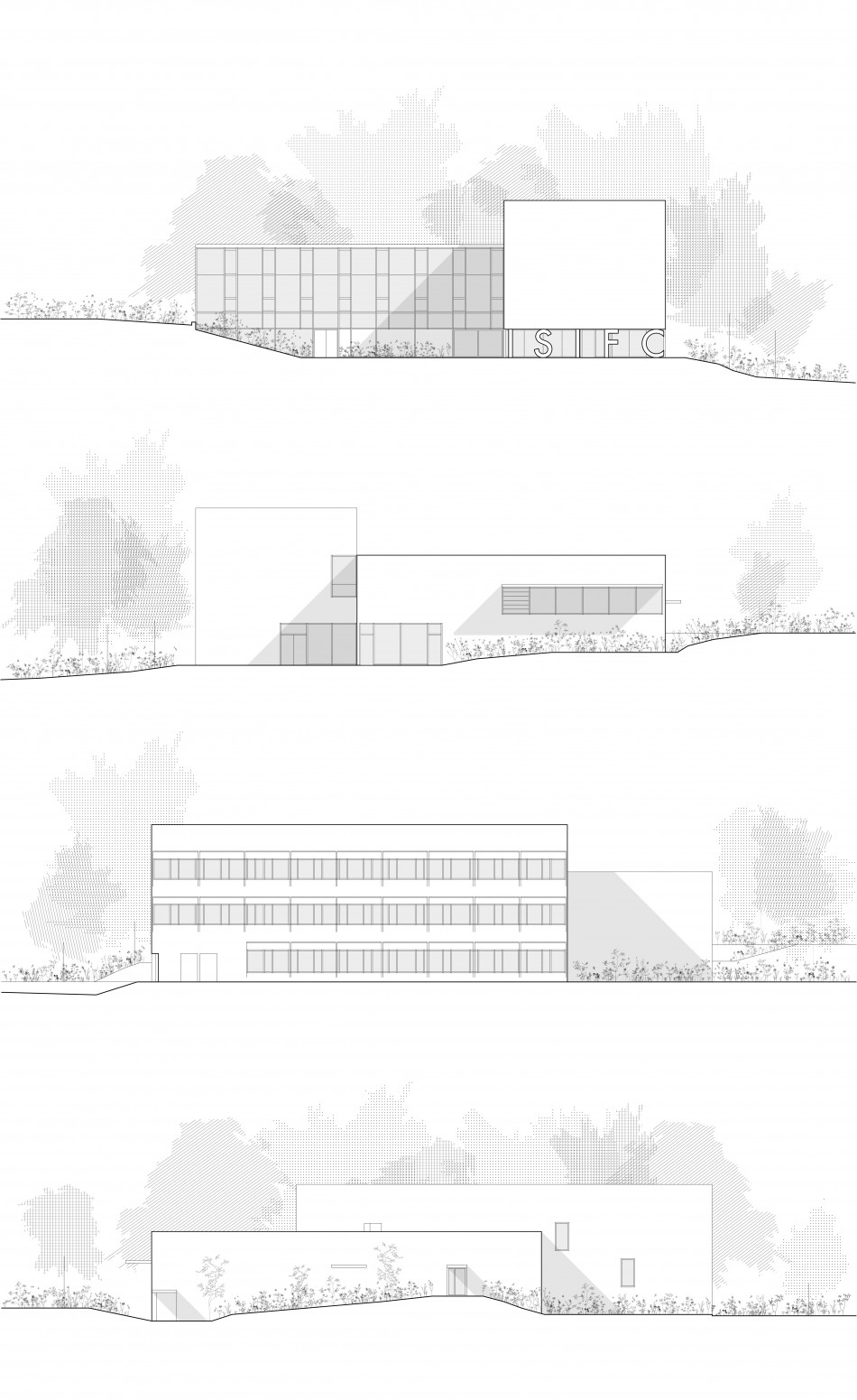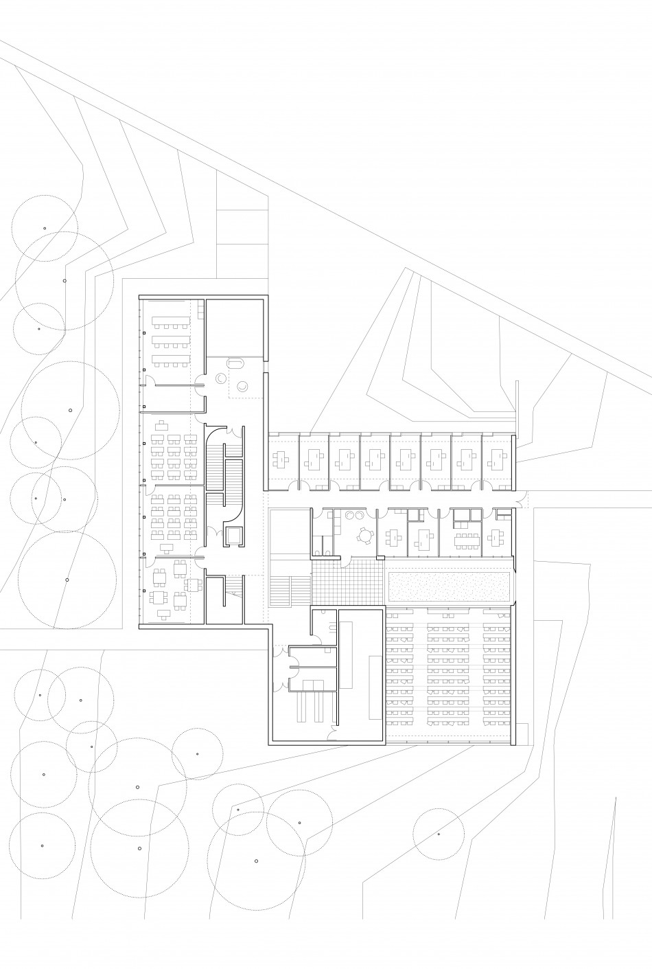 The engineering school lies on the Bouloie-Temis campus in Besançon, France, in parallel to the road that runs up its biggest slope. The positioning of the spaces built creates the major advantage of being absorbed by a small listed wood, which forges a close relationship between the rooms and the trees, which are very near to the elevations.