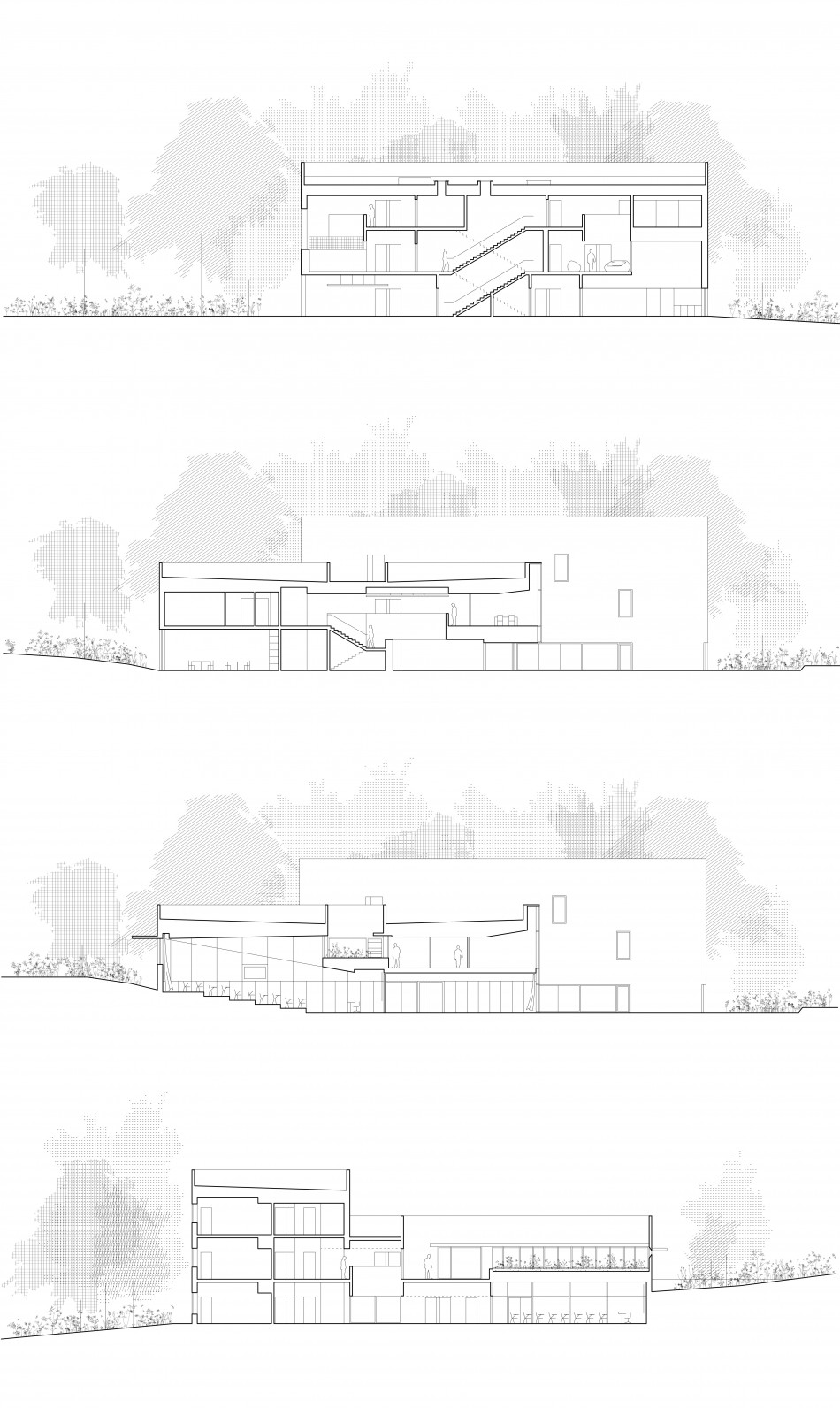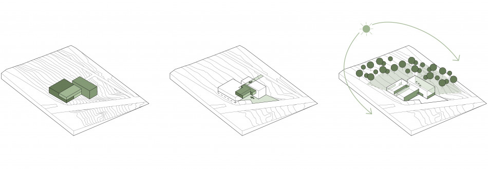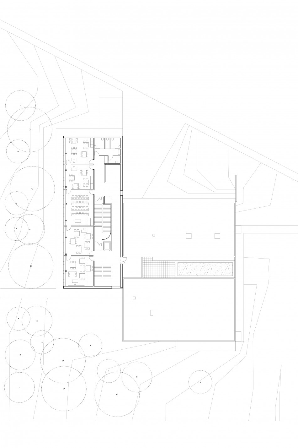 The second section was placed on pillars for flexible use of the spaces and in order to leave the possibility of an extension being built later. The classrooms offer a sweeping view of the woods and the tall trees provide them with coolness and protection from the sun.
