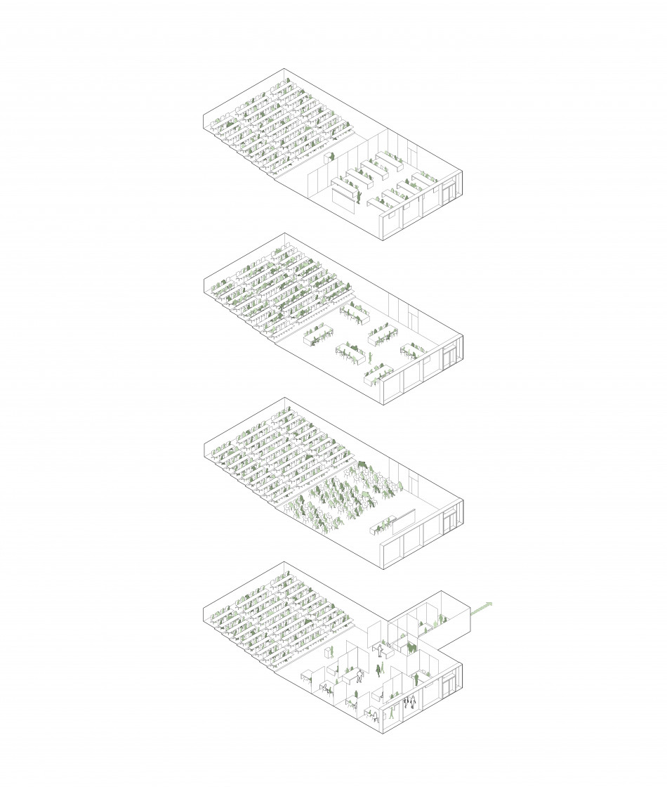 The idea of a gradual slide made it possible for us to create a transitional space that produced inner spaciousness. The collective spaces were designed to make interactions easier and to also make it easier to organise exhibitions, which take place regularly here, given the teaching approach of this engineering school.
